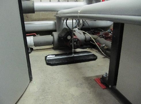 Onderstaande foto illustreert de uitgevoerde maatregel, namelijk het plaatsen van de pomp op een speciale trillingsmat. Duidelijk is te zien dat er geen starre verbinding meer is tussen de pomp en de vloer.