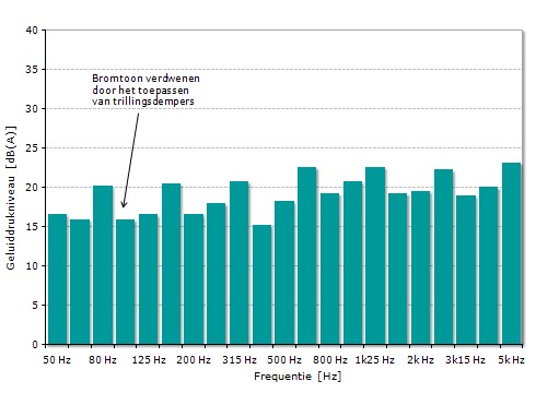 De bromtoon waar de bewoner over klaagt wordt in bovenstaande figuur weergegeven door de piek bij 100 Hz. Met behulp van de uitgevoerde metingen en de eigenschappen van de pomp (massa, toerental en wijze van ondersteuning) is een correcte trillingsdemper geadviseerd. De selectie van de juiste trillingsdemper is specialistisch werk. Door het toepassen van een verkeerde trillingsdemper kan een machine gaan resoneren waardoor de vloer juist meer geluid gaat afstralen!