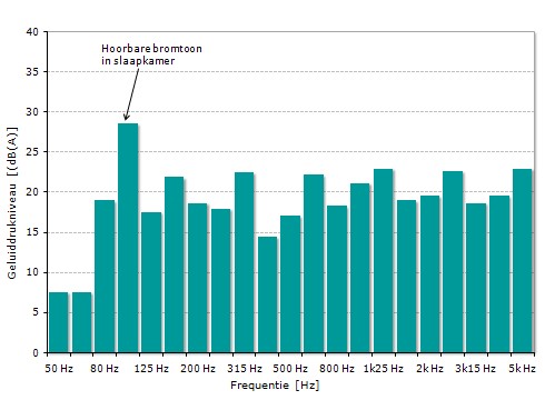 Door de maatregel is de bromtoon meer dan 10 dB(A) afgenomen. Onderstaande figuur geeft het geluidspectrum in de slaapkamer weer ná het toepassen van de geadviseerde trillingsmatten.